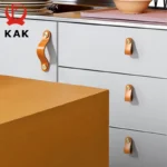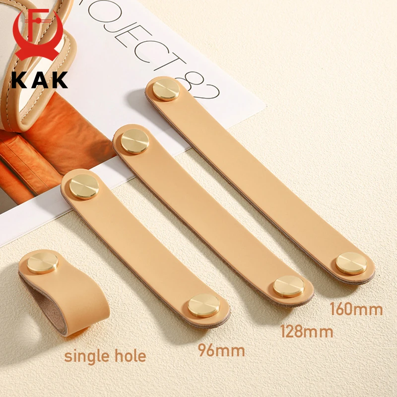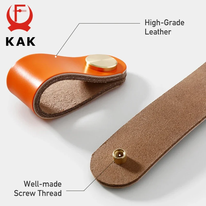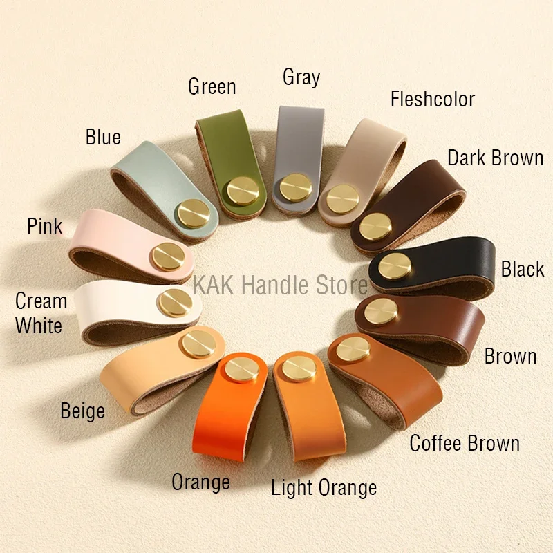 KAK Cowhide Leather Cabinet Handles Nordic Furniture Handle for Kids Room Brass Copper Kitchen Handle Drawer Knobs Door Hardware